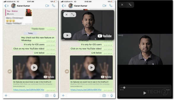 இந்த வீடியோகள் ஒரு சிறிய "பப்பில் விண்டோ"வில் பிளே செய்யப்படும், இந்த வீடியோ பப்பில் விண்டோவில் பாஸ், பிளே, கிளோஸ் மற்றும் புள் ஸ்கீரின் சேவைக்கான கட்டுப்பாடு கண்ட்ரோல்கள் வழங்கப்பட்டிருக்கிறது. இந்த வீடியோ பப்பில் விண்டோகளை வாட்ஸ் ஆப் திரையில் எங்கு வேண்டுமானாலும் நகர்த்திக் கொள்ளலாம்.