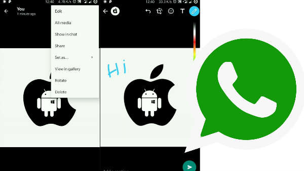 வாட்ஸ்ஆப் நிறுவனத்தின் இந்த புதிய அம்சம் சோதனை செய்யப்படுகிறது, என்றும் விரைவில் ஆண்ட்ராய்டு மற்றும் ஐஒஎஸ் இயங்குதளங்களுக்கு வழங்கப்படும் எனத் தெரிவிக்கப்பட்டுள்ளது. குறிப்பாக வாட்ஸ்அப் செயலியினுள் புகைப்படம் திறக்கப்பட்டதும் எடிட் பட்டன் காணப்படுகிறது. இதனை க்ளிக் செய்தால் டெக்ஸ்ட், டூடுள் அல்லது தலைப்பை சேர்க்கும் வசதி காணப்படுகிறது.