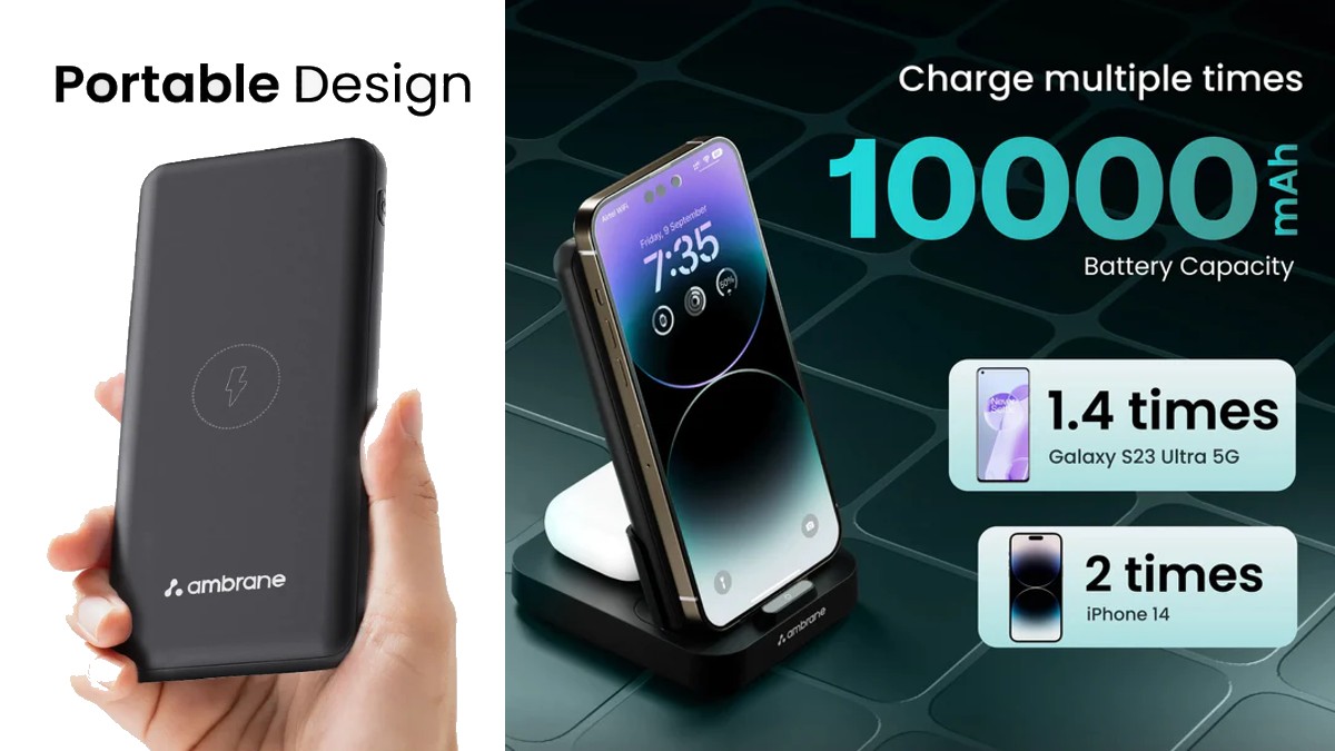 ஆம்பிரேன் (Ambrane) நிறுவனம் இந்திய சந்தையில், சற்றே வித்தியாசமான ஒரு புதிய தயாரிப்பை அறிமுகம் செய்துள்ளது. இது வயர்லெஸ் சார்ஜராக, போன் ஸ்டாண்ட்டாக, பவர் பேங்க் ஆக மற்றும் வயர்லெஸ் பவர் பேங்க் ஆக வேலை செய்யும் ஒரு 3-இன்-1 தயாரிப்பு ஆகும்.