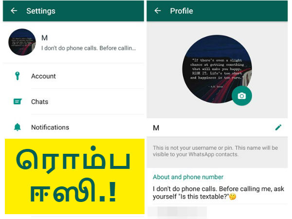 அதை நிகழ்த்த வாட்ஸ்ஆப்பில் இடது மேல் புறத்தில் உள்ள மூன்று டாட் மெனுவை கிளிக் செய்யவும், பின்னர், செட்டிங்ஸ் நுழைந்து அபௌட் அண்ட் போன் நம்பர் உள்நுழையவும் அங்கு நீங்கள் பழைய ஸ்டேட்டஸ் விருப்பத்தை மீண்டும் பார்ப்பீர்கள்.