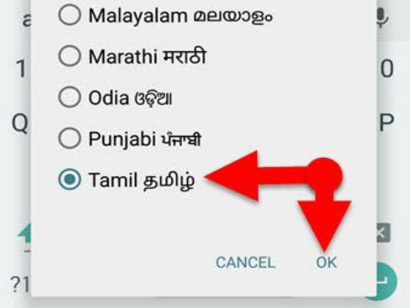 இப்போது நீங்கள் கீபோர்டின் மேல் பக்கம் "இந்திய மொழிகளின்" பொத்தானை பார்ப்பீர்கள், அதை தட்டவும், இப்போது பாப் அப் விண்டோவில் "தமிழ்" மொழியை தேர்ந்தெடுக்கவும்.