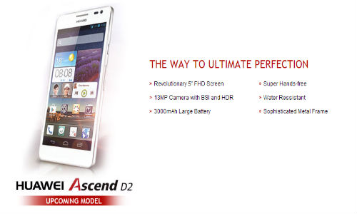 ஹுவாய் நிறுவனம் தனது லேட்டெஸ்ட் ஸ்மார்ட்போன் ஆன அசென்ட் டி2வை விரைவில் இந்தியாவில் வெளியிட உள்ளது. இந்நிறுவனம் கடந்த ஜூன் மாதம் அசென்ட் மேட் என்ற 6 இன்ஞ் பேப்லெட் போனை இந்தியாவில் வெளியிட்டது.