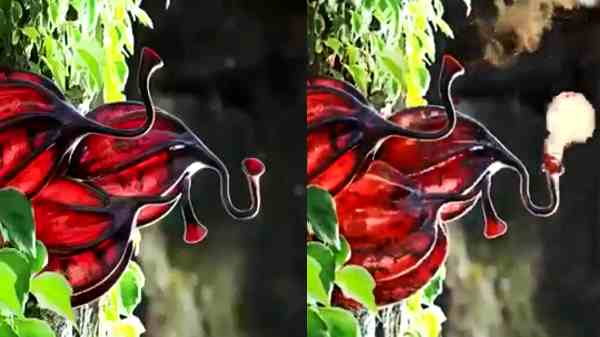 இணையத்தில் வைரல் ஆகும் இந்த வீடியோ பதிவில் காணப்படும் ஊது பாவை தாவரம், பார்ப்பதற்கு மெல்லிய ட்ரம்பெட் போன்ற புனல்கள் கொண்ட இலைகளால் சூழப்பட்ட மூன்று அழகான சிவப்பு உயிரினங்களின் உருவத்தைக் காண்பிக்கிறது. அதன் நுனியில் இருக்கும் புனல் போன்ற அமைப்பில் இருந்து மகரந்த தானியங்களைத் தாவரம் வெளியேற்றுவதை வீடியோ தெளிவாகக் காட்டுகிறது. இந்த தாவரத்தின் இலைகள் பலூன் போல ஒரு முறை காற்றில் ஊதி பின்னர் சுருங்கி மகரந்த துகள்களை வெளியேற்றுகிறது.