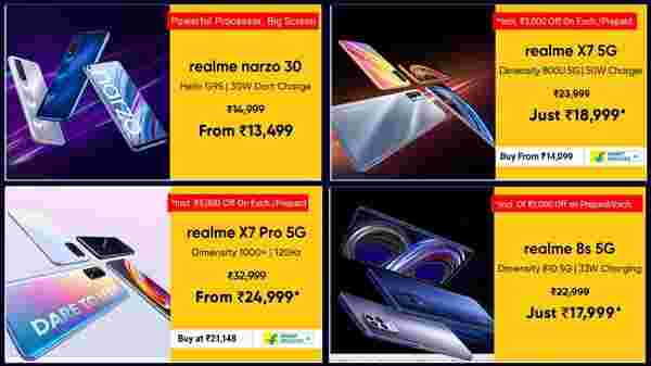 இந்த விற்பனையானது டிசம்பர் 9 முதல் டிசம்பர் 13 வரை நடைபெறுகிறது. ரியல்மி ஸ்மார்ட்போன்கள் மீது கவர்ச்சிகரமான தள்ளுபடிகள் வழங்குகின்றன. மேலும் இதில் இஎம்ஐ சலுகைகள் மற்றும் பரிமாற்ற தள்ளுபடிகள் வழங்கப்படுகின்றன. ரியல்மி ஸ்மார்ட்போன் வாங்க திட்டமிட்டிருந்தால் ரியல்மி 8 ப்ரோ, ரியல்மி எக்ஸ்7 5ஜி உள்ளிட்ட பல ஸ்மார்ட்போன்களுக்கு சலுகைகள் வழங்குகின்றன.