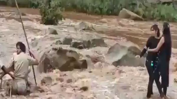 நீர்மட்டம் உயர்ந்ததை பார்த்த அவரது தோழிகள் பயத்தில் காவல்துறையினருக்கு தகவல் அளித்துள்ளனர். இதையடுத்தும் சம்பவ இடத்துக்கு வந்த மீட்பு படையினர் கயிற்றை கட்டி ஆற்றில் இறங்கி இரண்டு பெண்களையும் மீட்டனர். இந்த வீடியோ காட்சி சமூகவலைதளங்களில் வைரலாகி வருகிறது.