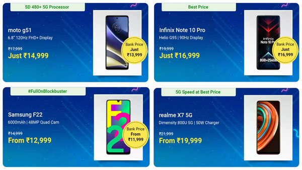 ரியல்மி, ரெட்மி, போக்கோ, ஒப்போ, மோட்டோரோலா, சாம்சங் மற்றும் இன்பினிக்ஸ் போன்ற பிராண்டுகளுக்கு பிளிப்கார்ட்டில் கிடைக்கும் தள்ளுபடிகள் குறித்த விவரங்களை பார்க்கலாம். பிளிப்கார்ட் எலெக்ட்ரானிக்ஸ் தின விற்பனையில் 30% வரை சாதனங்களுக்கு தள்ளுபடிகள் வழங்கப்படுகிறது. மேலும் சாதனங்களுக்கு இஎம்ஐ பேமெண்ட் மற்றும் எக்ஸ்சேஞ்ச் தள்ளுபடிகள் வழங்கப்படுகின்றன.