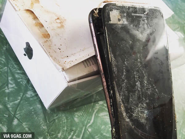 புத்தம் புதிய ஐபோன் 7 மேட் பிளாக் கருவி வெடித்துச் சிதறியதாக இப்புகைப்படத்தில் தெளிவாக தெரிகின்றது. சாம்சங் கருவிகள் பேட்டரி கோளாறு காரணமாக வெடித்துச் சிதறிய விலையில் ஐபோன் 7 கருவி விநியோகம் செய்யப்படும் போது வெடித்திருந்ததாகக் கூறப்படுகின்றது.