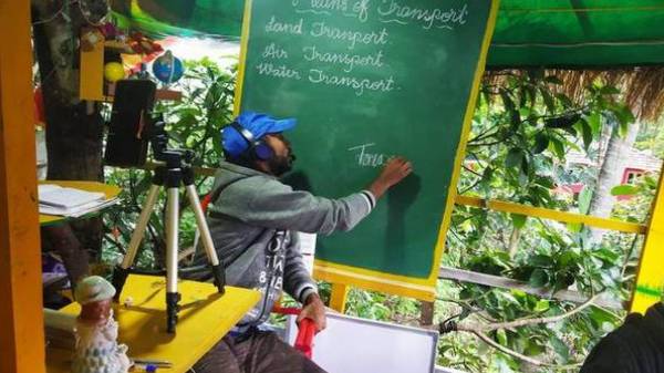 குறிப்பாக மரத்தின் மீது பலகை அமைத்து, பின்பு ஆன்லைன் வகுப்புக்கு தேவையான கேமரா போன்றவற்றை செட் செய்துஆன்லைன் வகுப்பு எடுத்து வருகிறார். இந்த சம்பவம் இணையத்தில் பரவியதையடுத்து அந்த ஆசிரியருக்கு பாராட்டுக்கள் குவிந்து வருகிறது.