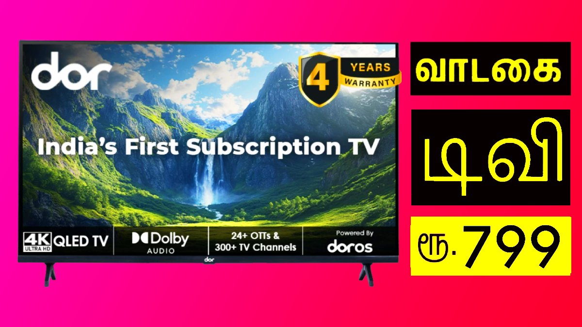 இந்தியாவிலேயே முதல் முறையாக இத்தகைய டிவி சந்தா திட்டத்தை ஸ்ட்ரீம்பாக்ஸ் மீடியா (Streambox Media) நிறுவனம் தான் அறிமுகம் செய்துள்ளது. இந்த டிவியை நிறுவனம் டோர் (Dor) டிவி என்று அழைக்கிறது. இந்த டிவியை நீங்கள் ஒரு முறை அட்வான்ஸ் தொகை மட்டும் செலுத்தி வாங்கிக்கொள்ளலாம். அதற்கு பிறகு 1 வருடத்திற்கு மாதம் ரூ. 799 மட்டும் சந்தா கட்டணமாக செலுத்தி டிவியை தொடர்ந்து பயன்படுத்தி வரலாம்.