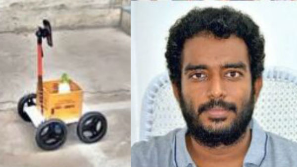 குட்டீஸ் பயன்படுத்தும் சைக்கிள் சக்கரம் நாலை யூஸ் பண்ணி ஒரு கியருடன், சென்சார் கருவிகளை பொருத்தி மொபைலுடன் கனெக்ட் செய்து இந்த ரோபோவை இயங்கும்படி வடிவமைத்து உருவாக்கியுள்ளார்.தற்போது இந்த ரோபோ 30 கிலோ எடை வரை கொண்டு செல்லக்கூடியது, மேலும் இது ஒரு முறை சார்ஜ் செய்தால் ஆறு முதல் ஏழு மணி நேரம் வரை பயன்படுத்தல் என்று கூறியுள்ளார்.