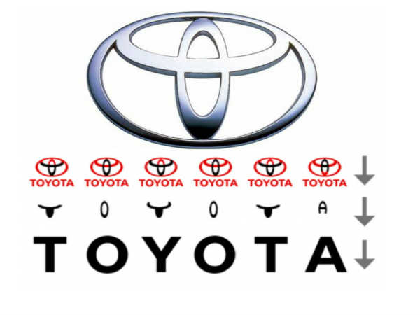 டொயோட்டா உண்மையில் அது ஒரு ஊசியின் கண்களின் ஒரு பகட்டான உருவத்தை பிரதிபலிக்கிறது. இது நெசவு இயந்திரங்கள் தயாரிக்க பயன்படுகிறது. எனினும், லோகோவின் தனிப்பட்ட பகுதிகள் நிறுவனத்தின் பெயர் கடிதங்களை உச்சரிக்கின்றன.