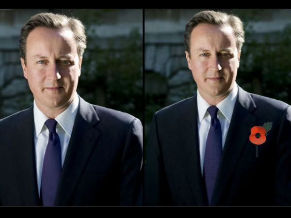 கனடாவில், உயிர் தியாகம் செய்த போர் வீரர்களை நினைவுப்படுத்தும் நாளான நினைவுறுத்தும் நாள் அன்று, பிரதமர் டேவிட் கேமரூன் நெஞ்சில் பொய்யாக 'போட்டோஷாப்' செய்து பொருத்தப்பட்ட பேஜ்.