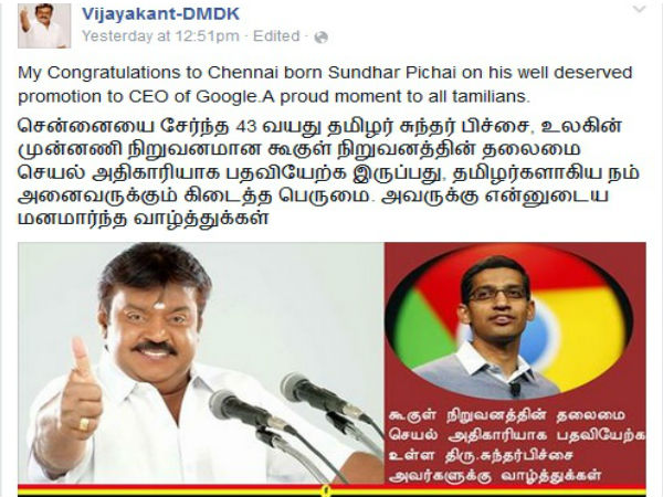 "நம்மாளு சுந்தர் பிச்சை ஒருத்தர் இருக்காரு.." என்று ஆரம்பித்து கூகுளின் புதிய சிஇஓ-வாக பொறுப்பேற்க்க இருக்கும் சென்னையை சேர்ந்த சுந்தர் பிச்சைக்கு, தனக்கே உரிய பாணியில் வாழ்த்து கூறியுள்ளார் கேப்டன் விஜயகாந்த்..!