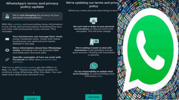 பயனர்கள் வாட்ஸ்அப்பின் தனியுரிமை விதிகளை ஒப்புக் கொள்ளும்படி நிறுவனம் தெரிவித்துள்ளது. அப்படி செய்யாதபட்சத்தில் அணுகலை இழக்க நேரிடும் எனவும் தெரிவிக்கப்பட்டுள்ளது.