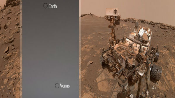 ஒரு வாரத்திற்கு முன்பு,கியூரியாசிட்டி ரோவர் சூரிய அஸ்தமனத்திற்கு ஒரு மணி நேரத்திற்குப் பிறகு, தனது மாஸ்ட்கேம்-ஐ வானத்தை நோக்கி நிலைநிறுத்தி இரண்டு படங்களை எடுத்தது. ஒன்று பூமியையும் மற்றொன்று வீனஸையும் காட்டுகிறது.