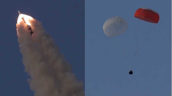 விண்கலத்தின் இருந்து விஞ்ஞானிகள் மற்றும் மனிதர்கள் இருக்கும் பகுதி மட்டும் தனியாக பிரிந்து பாராசூட் மூலம் மெதுவாக கீழிறங்கி