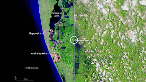 இன்று அமெரிக்க நாசா விண்வெளி ஆராய்ச்சி மையம், கேரளா வெள்ளத்திற்கு முன்பு எப்படி இருந்தது வெள்ளத்திற்குப் பின் கேரளாவின் நிலை தற்போது எப்படி இருக்கிறது என்று தனது செயற்கைக்கோள் மூலம் எடுக்கப்பட்ட புகைப்படங்களை வெளியிட்டுள்ளது.