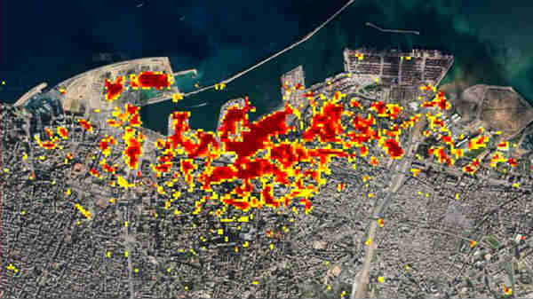 லெபனான் தலைநகர் பெய்ரூட்டில் கடந்த வாரம் நடத்தப்பட்ட குண்டு வெடிப்புக்குக் காரணமானவர்களை உடனடியாக கண்டுபிடித்து கைது செய்யக்கோரி அந்நாட்டில் போராட்டங்கள் வெடித்துள்ளது. தற்பொழுது அமெரிக்க விண்வெளி ஆராய்ச்சி மையம், ARIA செயற்கைக்கோள் உதவியுடன் பாதிக்கப்பட்ட பகுதியின் ரேடார் தரவு கொண்ட வரைபடத்தை தற்பொழுது வெளியிட்டுள்ளது.