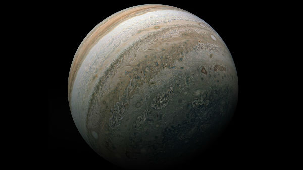 நாசாவின் ஜூனோ விண்கலத்திலிருந்து. பிரம்மாண்டமான வியாழன் கிரகத்தின் வளிமண்டலத்தின் சுழல்கள் மற்றும் அதன் உன்னதமான பட்டைகள் மற்றும் கோடுகள் ஆகியவை பிரபஞ்சத்தின் இன்னொரு வடிவை இந்த புகைப்படம் காட்டுகிறது.