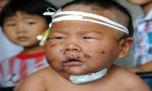 பெரும்பாலும் முகம் முழுக்க கத்திரியால் குத்தப்பட்ட அந்தக் குழந்தைக்கு சுமார் 100 தையல்கள் போடப்பட்டுள்ளன.
