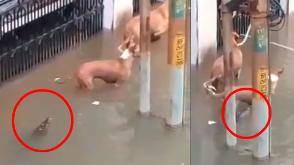 நேற்று முதல் சமூக ஊடகங்கள் மற்றும் செய்தி தளங்களில் இந்த வீடியோ வேகமாகப் பகிரப்பட்டு வருகிறது. வெள்ளம் சூழ்ந்த குடியிருப்பு தெருவில் நாய் ஒன்று தண்ணீரில் தத்தளித்து நடந்து செல்கிறது. திடீரென ஒரு முதலை நீருக்குள்ளிருந்து தலையை நீட்டி நாயை நோட்டமிடுவது பதிவாகியுள்ளது.